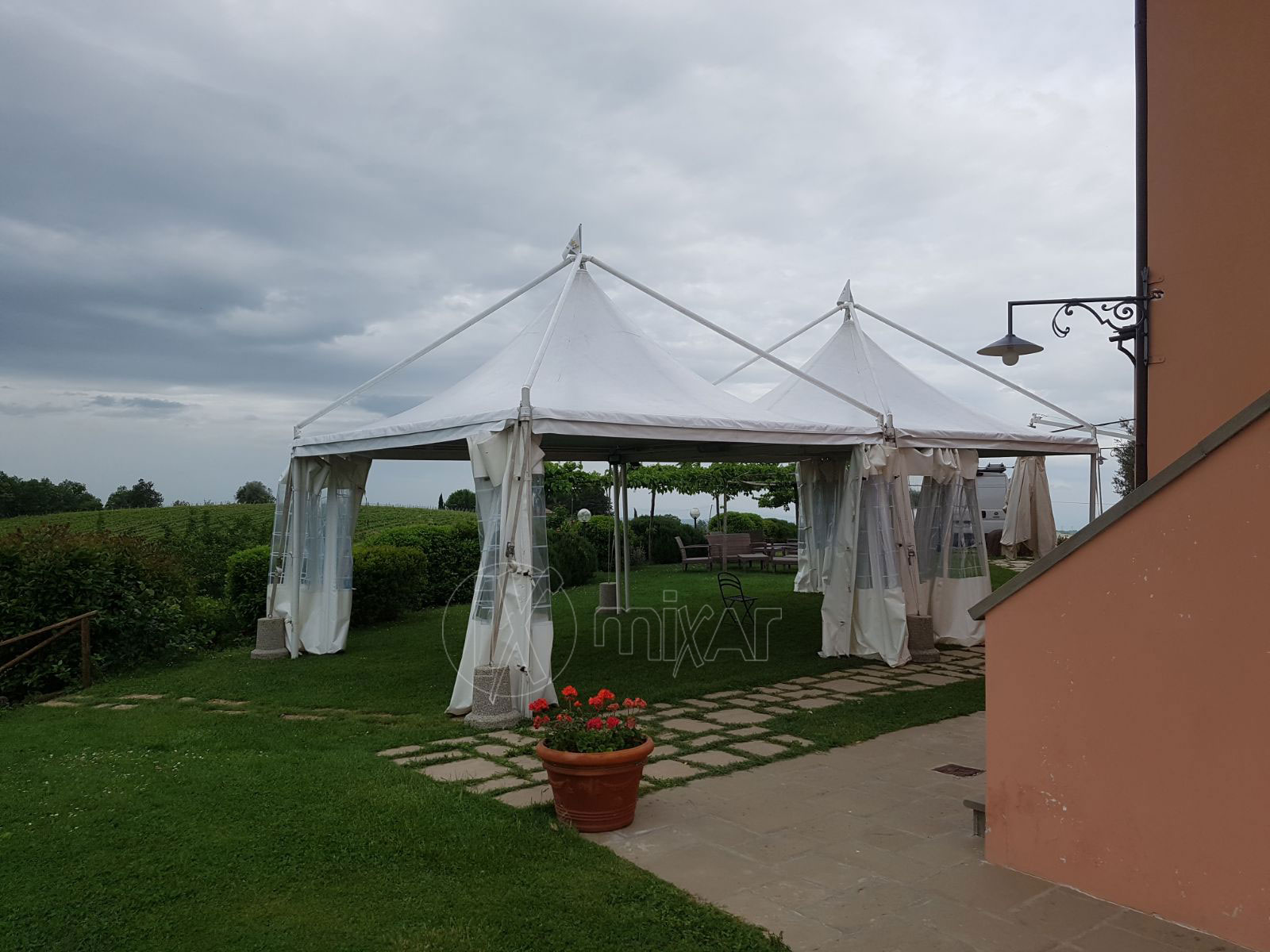 Gazebo pagoda 5X5 per wedding party ricevimenti di nozze e compleanni , ideale per coperture di piccole e medie feste di nozze o eventi privati come compleanni, cerimonie comunioni e feste di laurea. questa pagoda ha una dimensione di Mt. 5X5 per un totale di 25 Mq. è in grado di ospitare fino a 20 persone comodamente.