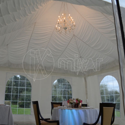 Viene fornito completo di teli laterali scorrevoli con finestre in cristal oppure in pvc bianco, secondo le necessità dell’evento.